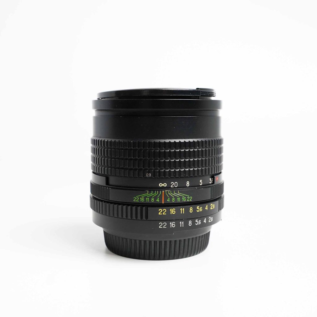 green and yellow markings on the distance and aperture scales — characteristic of the early batches, setting them apart from later copies where the engravings often appear in a more common orange color. This visual detail doesn’t affect image quality, but it does make the lens easier to identify and appreciate as an early production piece.